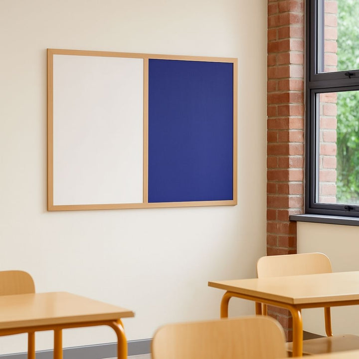 Selected by Displaysense for its compact, dual-use layout and reduced plastic design, this combination board features a blue felt pin surface alongside a dry wipe writing panel. The wood-effect frame offers a warmer, more natural look than plastic alternatives — ideal for spaces that balance function with a softer aesthetic.