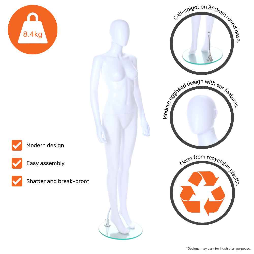 This matt white female mannequin features an egghead design with sculpted ears, making it perfect for retailers who want to pair clothing with headphones, earrings or other audio accessories. Its recyclable body offers a sustainable solution for fashion brands seeking to reduce environmental impact without sacrificing display quality.