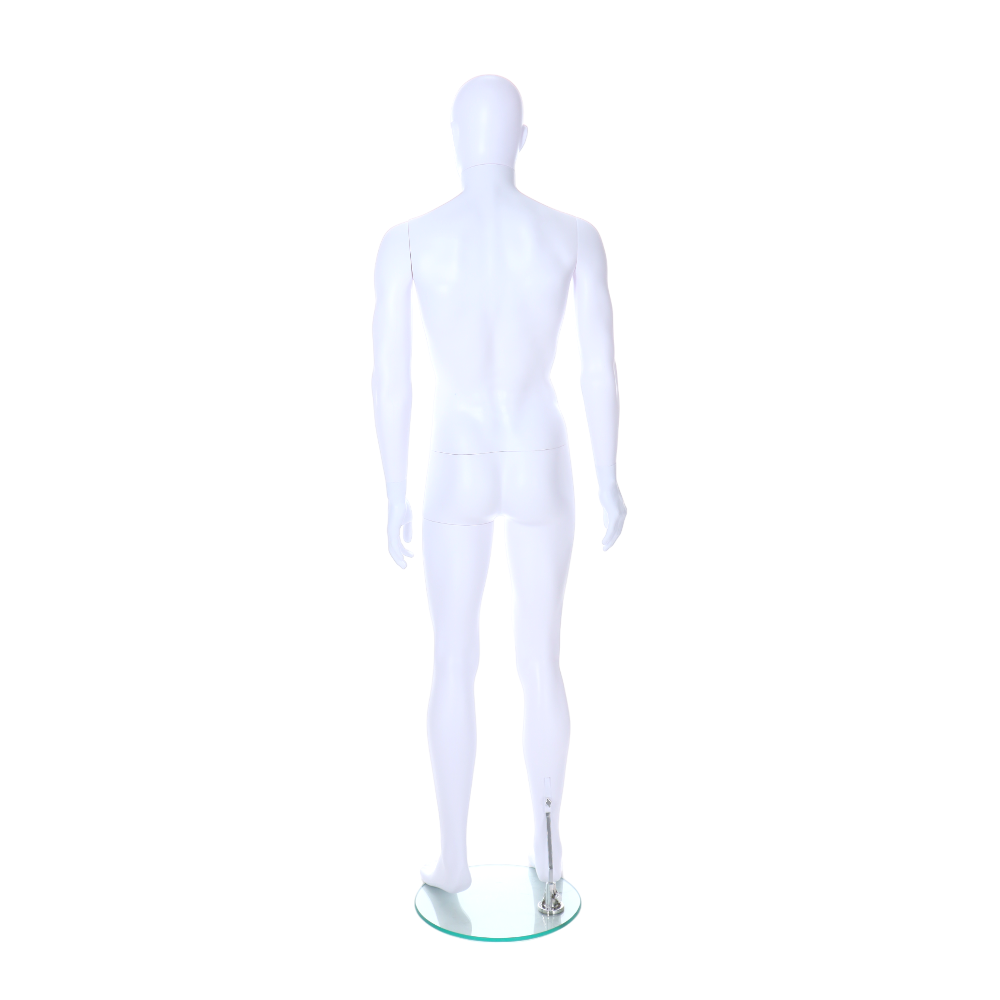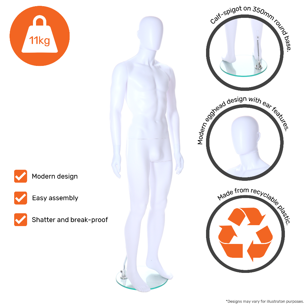 This male mannequin provides a durable and stylish solution for displaying clothing in any retail setting. Crafted from eco-friendly polyethylene, this life-size mannequin offers a robust, break-resistant design, ideal for high-traffic store environments. Its lightweight construction ensures easy movement and repositioning, making it perfect for evolving store layouts. The mannequin’s sleek matt white finish and minimalist egghead design with defined ears bring a modern aesthetic to any display. A calf spigot and 380mm round base provide secure support without compromising on style.