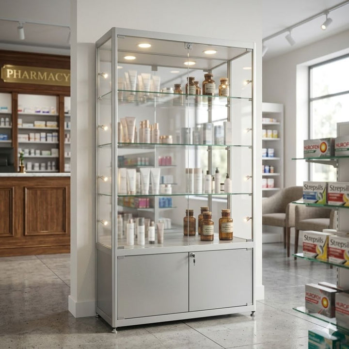 | Retail and Boutique | Jewellers, gift shops and boutiques where the base holds replenishment stock immediately below the active display. The silver frame suits pale and neutral interiors. Lockable doors protect high-value merchandise from unsupervised access. |