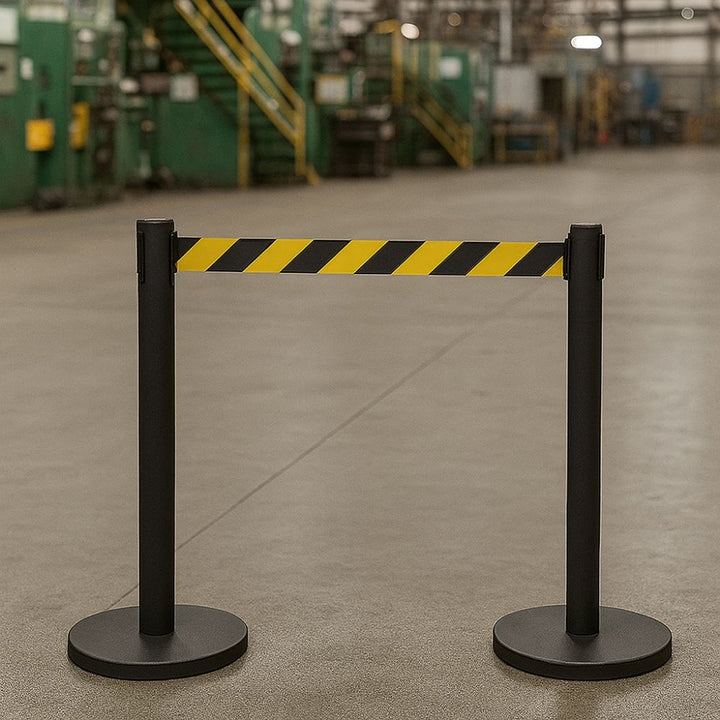 Perfect for environments that require high-impact visibility—such as logistics hubs, construction zones, or back-of-house retail areas—this barrier helps clearly define danger zones or off-limits spaces. The black steel post ensures stability while the chevron belt provides a clear visual warning.